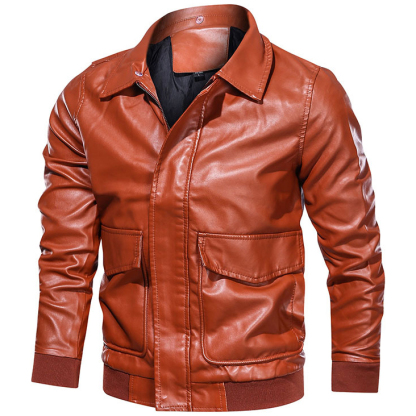 Men's Lapel Solid Color Large Pocket Biker Leather Jacket